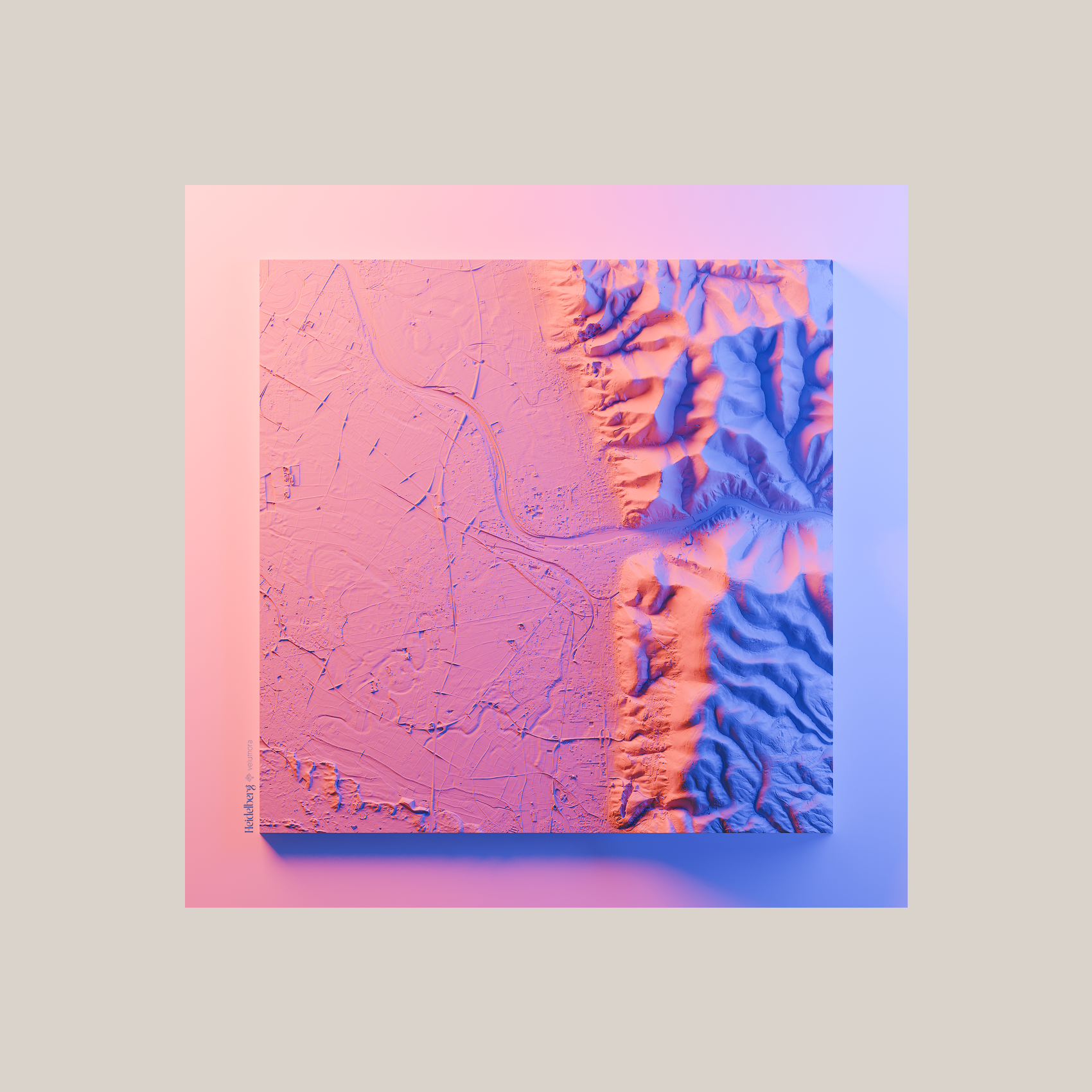 Das Motiv kombiniert ein präzises Höhenmodell mit aktuellen Satellitendaten. So werden Talböden, Hangstufen, Rückenlinien und Schwemmlandterrassen sichtbar – vom Heiligenberg über das Neckarufer bis in die offene Ebene. Durch bewusst gesetztes Licht entstehen dramatische Schattenspiele, die Reliefkanten und Kerbtäler plastisch betonen, obwohl der Druck flach bleibt.
