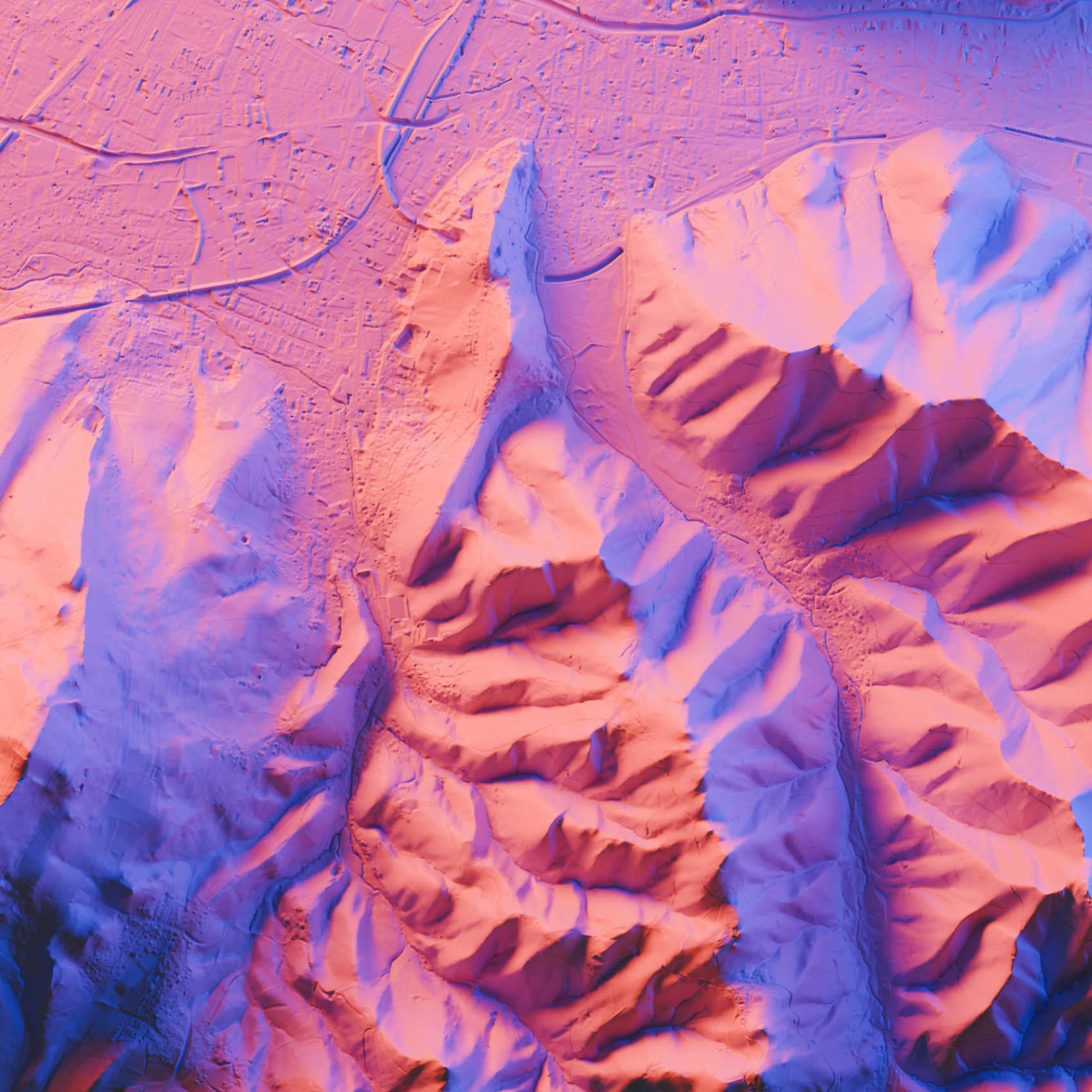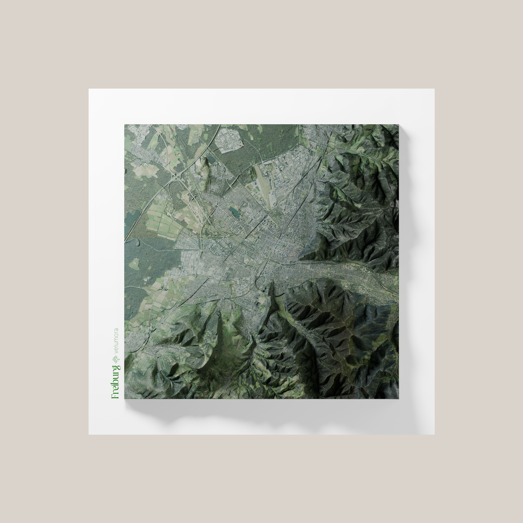 Das Motiv kombiniert präzises Höhenmodell und aktuelle Satellitendaten. So werden Geländeformen der Stadt sichtbar von den Rippen des Schlossbergs über die Uferbereiche der Dreisam bis zu den flacheren Schwemmlandterrassen im Westen. Durch gezielt gesetztes Licht entstehen dramatische Schatten, welche Rücken, Kerbtäler und Hangstufen plastisch hervorheben, während der Druck selbst flach bleibt.