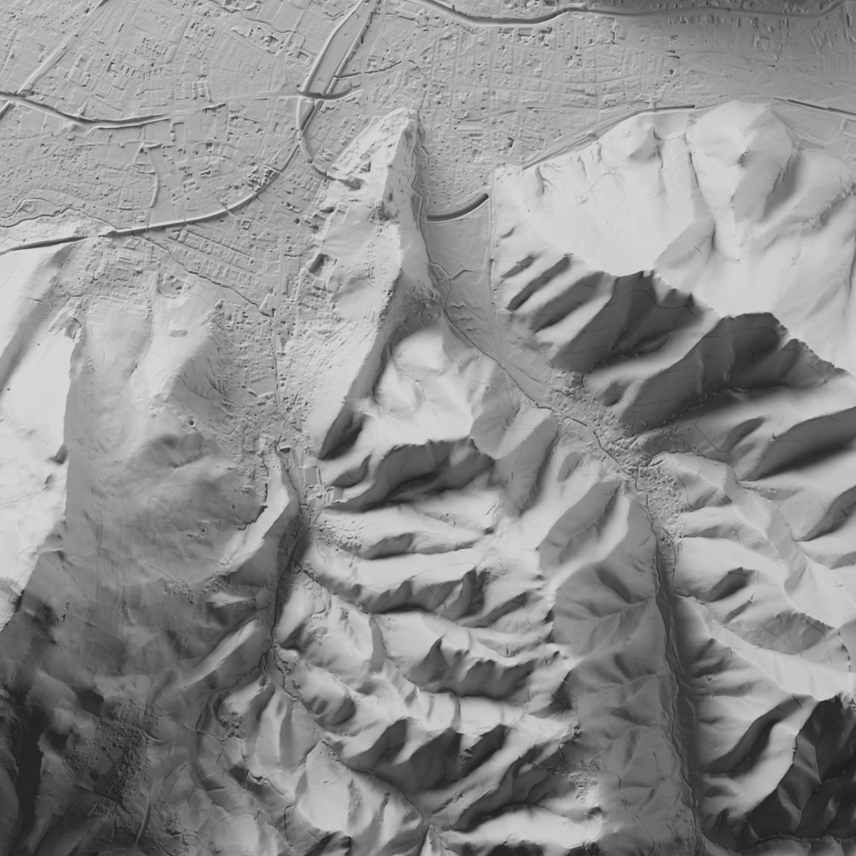 Freiburg liegt zwischen Schwarzwaldhängen und Oberrheinebene. Auf der Karte treten Dreisam-Tal, Schlossberg und die flacheren Übergänge in die Ebene klar hervor – sichtbar als Täler, Rücken und Terrassenformen der Stadtlandschaft.