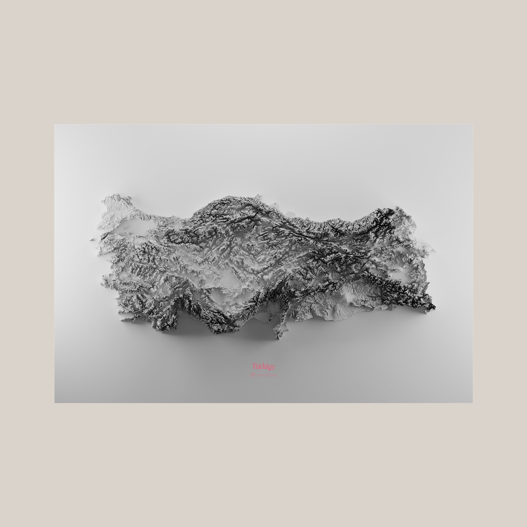Print-on-Demand Herstellung mit individueller Produktion nach Bestellung und direktem Versand. Hochauflösender Giclée-Druck auf 200 gsm Fine-Art-Papier in Museumsqualität mit glatter, matter Oberfläche. Das Motiv nutzt gezielt gesetztes Licht, sodass klare Schatten die sichtbaren Reliefstrukturen der Türkei betonen und die unterschiedlichen Landschaftsräume deutlich hervortreten.